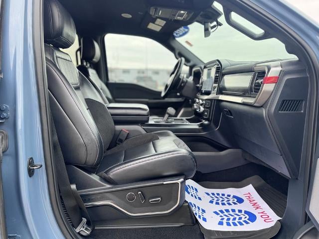 Azure Gray Metallic 2023 Ford F-150 Raptor 4WD 4D SuperCrew 3.5L V6 EcoBoost 10-Speed Automatic 4WD, 17 Cast Aluminum Wheels, 18 Speakers, 4-Wheel Disc Brakes, ABS brakes, Adaptive suspension, Adjustable pedals, Air Conditioning, Alloy wheels, AM/FM radio: SiriusXM with 360L, Auto High-beam Headlights, Auto tilt-away steering wheel, Auto-dimming door mirrors, Auto-dimming Rear-View mirror, Automatic temperature control, Brake assist, Bumpers: body-color, Compass, Delay-off headlights, Driver door bin, Driver vanity mirror, Dual front impact airbags, Dual front side impact airbags, Electronic Locking w/4.10 Axle Ratio, Electronic Stability Control, Emergency communication system, Equipment Group 801A Standard, Exterior Parking Camera Rear, Front anti-roll bar, Front Bucket Seats, Front Center Armrest, Front dual zone A/C, Front fog lights, Front reading lights, Front wheel independent suspension, Fully automatic headlights, Garage door transmitter, GVWR: 7,300 lbs Payload Package, Heated door mirrors, Heated front seats, Heated rear seats, Heated steering wheel, Illuminated entry, Inclination/Intrusion Sensor Removal, Lane Departure Warning System, Leather Trim Seats w/Heated 2nd Row, Low tire pressure warning, Memory seat, Navigation system: Connected Navigation, Occupant sensing airbag, Outside temperature display, Overhead airbag, Overhead console, Panic alarm, Passenger door bin, Passenger vanity mirror, Pedal memory, Power door mirrors, Power driver seat, Power passenger seat, Power steering, Power windows, Radio data system, Radio: B&O Unleashed Sound System by Bang & Olufsen, Rain sensing wipers, Rear reading lights, Rear step bumper, Rear window defroster, Remote keyless entry, Security system, Speed control, Speed-sensing steering, Split folding rear seat, Steering Wheel Heat Removal (DISC), Steering wheel memory, Steering wheel mounted audio controls, SYNC 4 w/Enhanced Voice Recognition, Tachometer, Telescoping steering wheel, Tilt steering wheel, Traction control, Trip computer, Turn signal indicator mirrors, Variably intermittent wipers, Ventilated front seats, 4WD.
